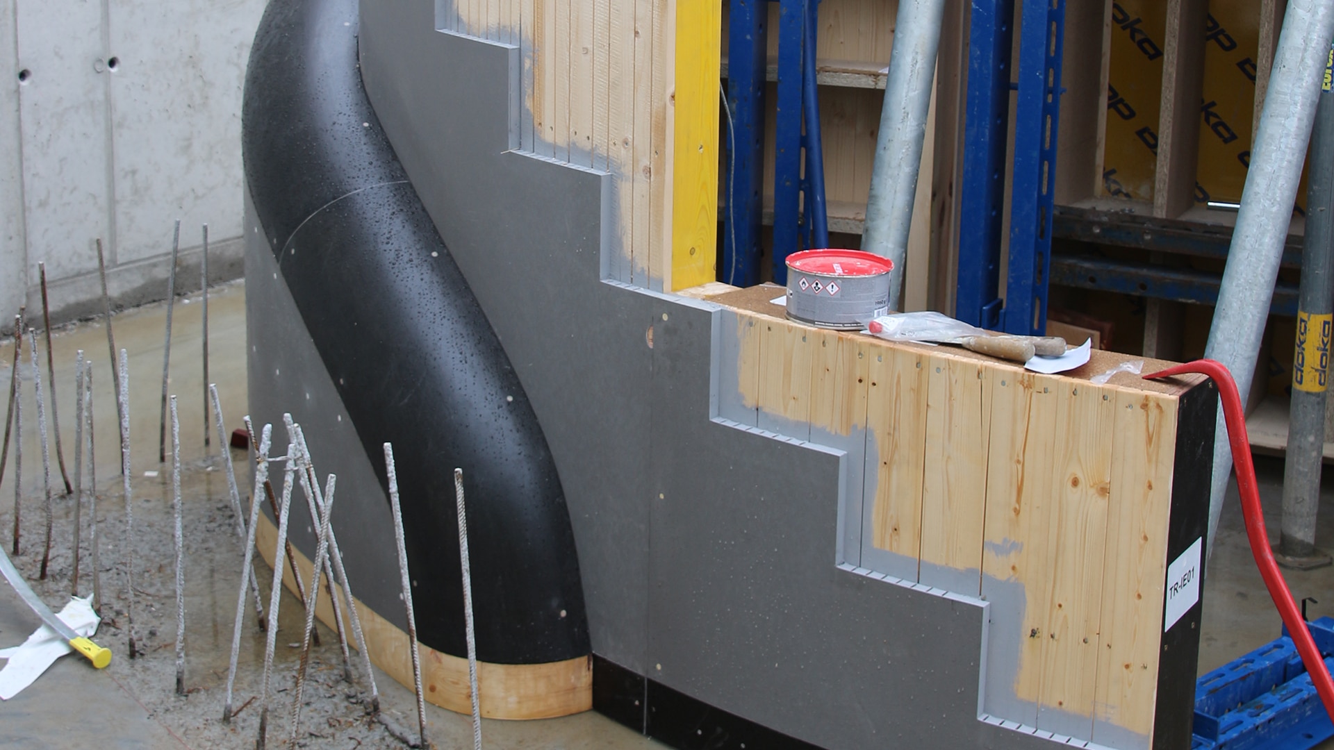 During the construction of the headquarters of the Sächsische Aufbaubank in Leipzig, (Germany), a semi-circular staircase with an intermediate platform was to be erected, which is mounted on a supporting wall. In order to give the staircase a smooth, uniform curve, an incredibly complex but precise concrete formwork was required.