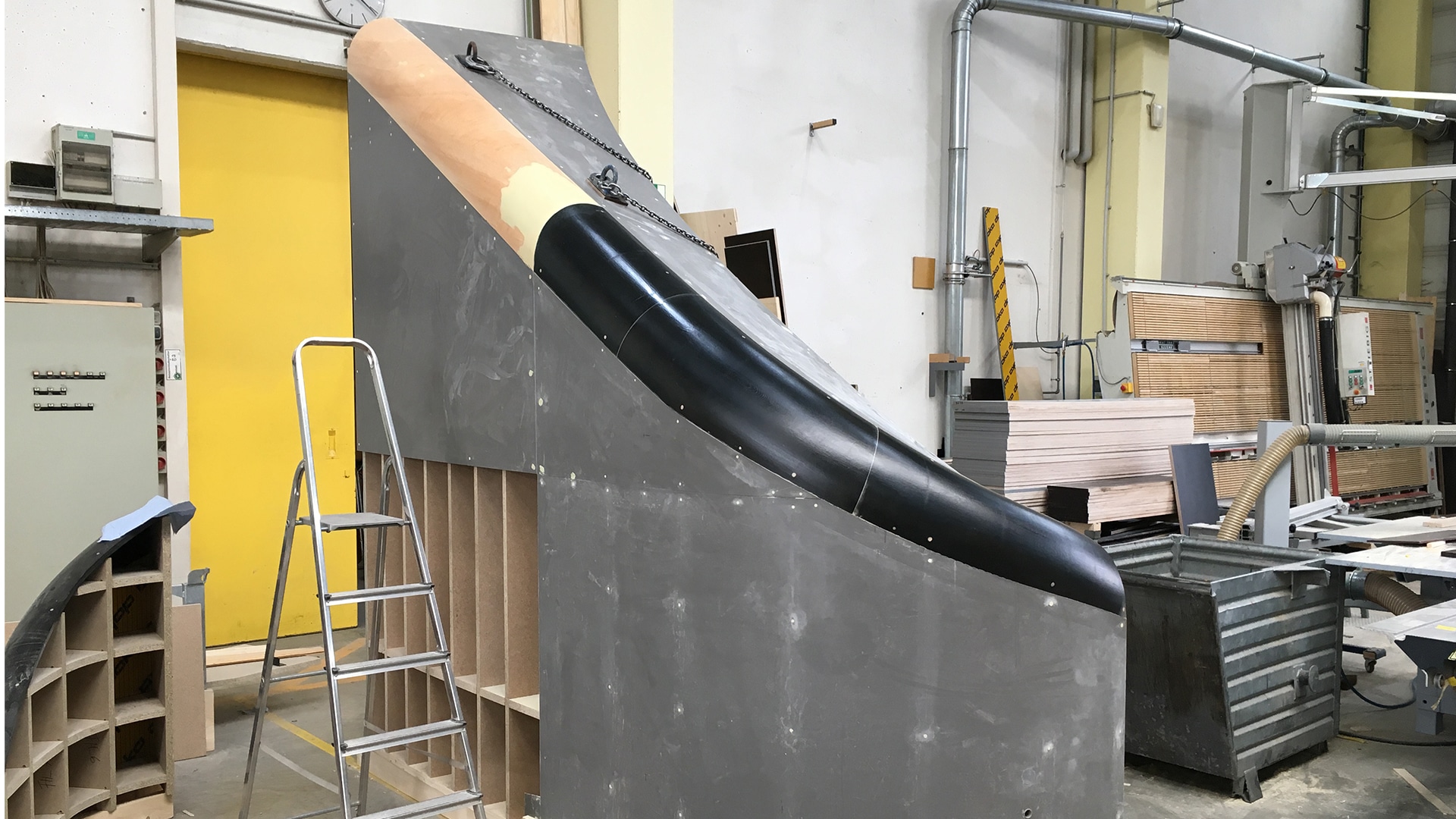 The production of such shapes with conventional craftsmanship is extremely time-consuming. Wooden bars have to be cut, bent into shape, fixed and bonded together. Subsequently, the surface must be sanded and smoothed several times before it is varnished twice. The result is a part whose load-bearing components have been assembled under tension and were manufactured out of organic materials. Under the influence of temperature and humidity fluctuations at the construction site as well as general weather conditions, wooden cracks can easily occur which visibly affects the quality.