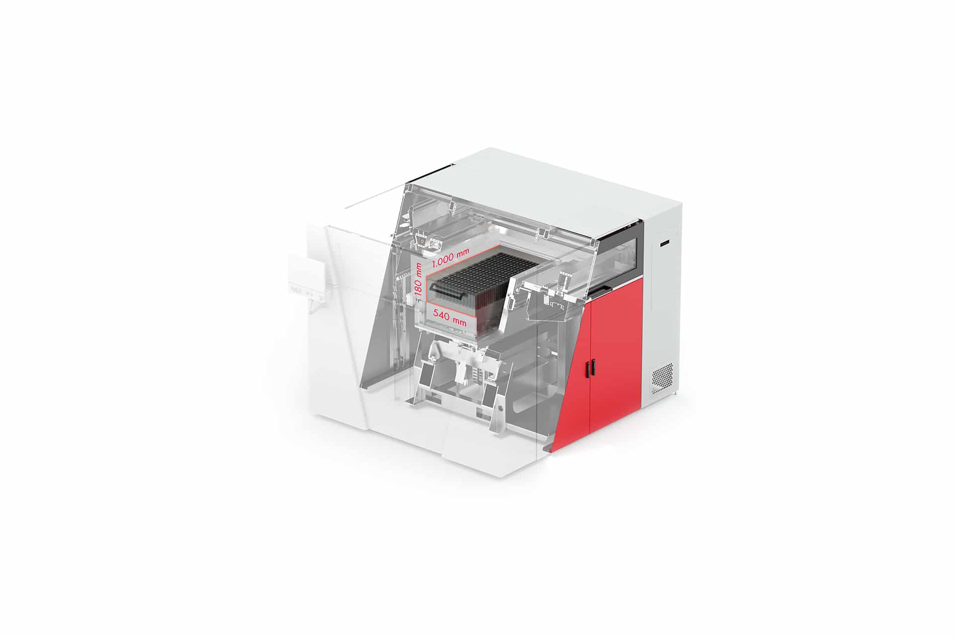 Height 400 mm*, Length 1.000 mm, Width 540 mm (*depending on used material, powder quality and recyclability can vary and thus reduced build heights might be recommended)