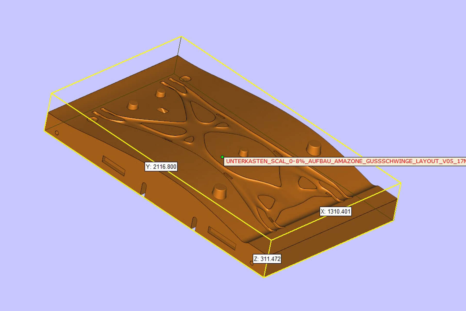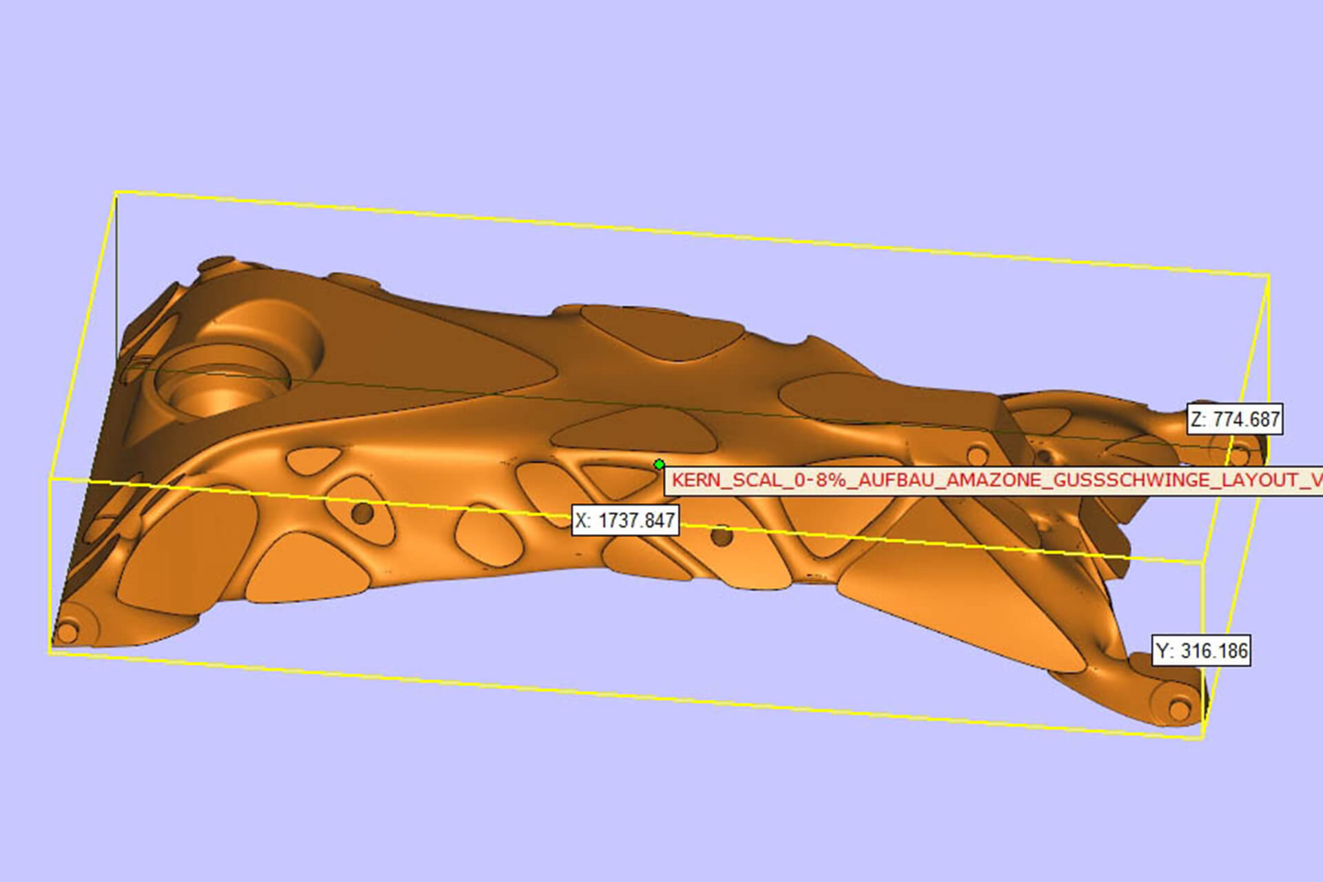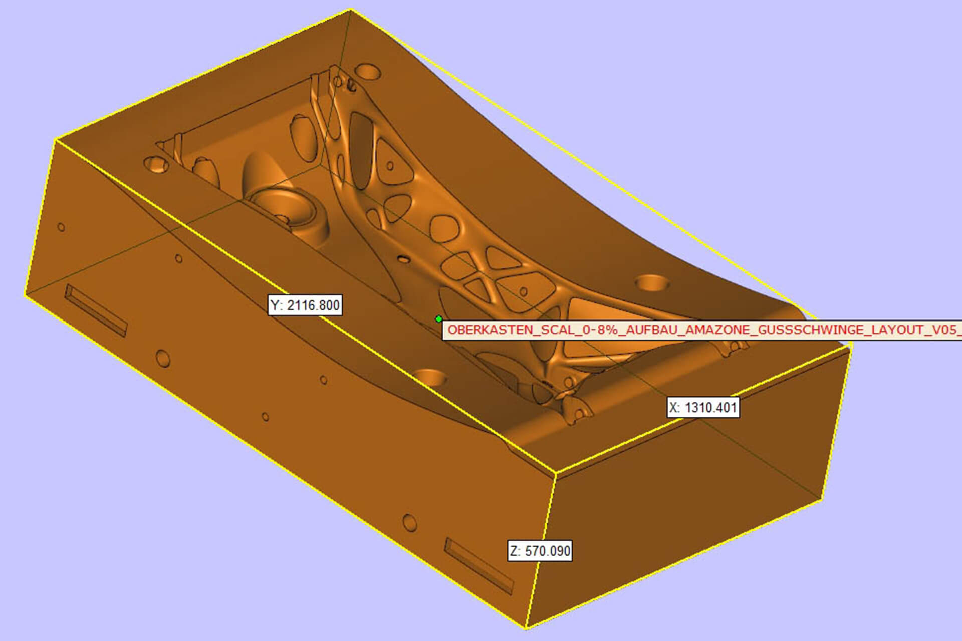 The bogey chassis connects the device to the axle to enable the device to be transported from the farm to the field. The original welded construction had a weight of 245 kilograms and a welding seam length of 16.5 metres, making it very complex and production-intensive. In order to reduce costs and make the component more stable and lighter, Amazone decided to replace the bogey chassis with a cast component. Using the topology optimisation software “Inspire” by Altair, the Amazone development team was able to create a design that was suitable for the load and could also be cast.