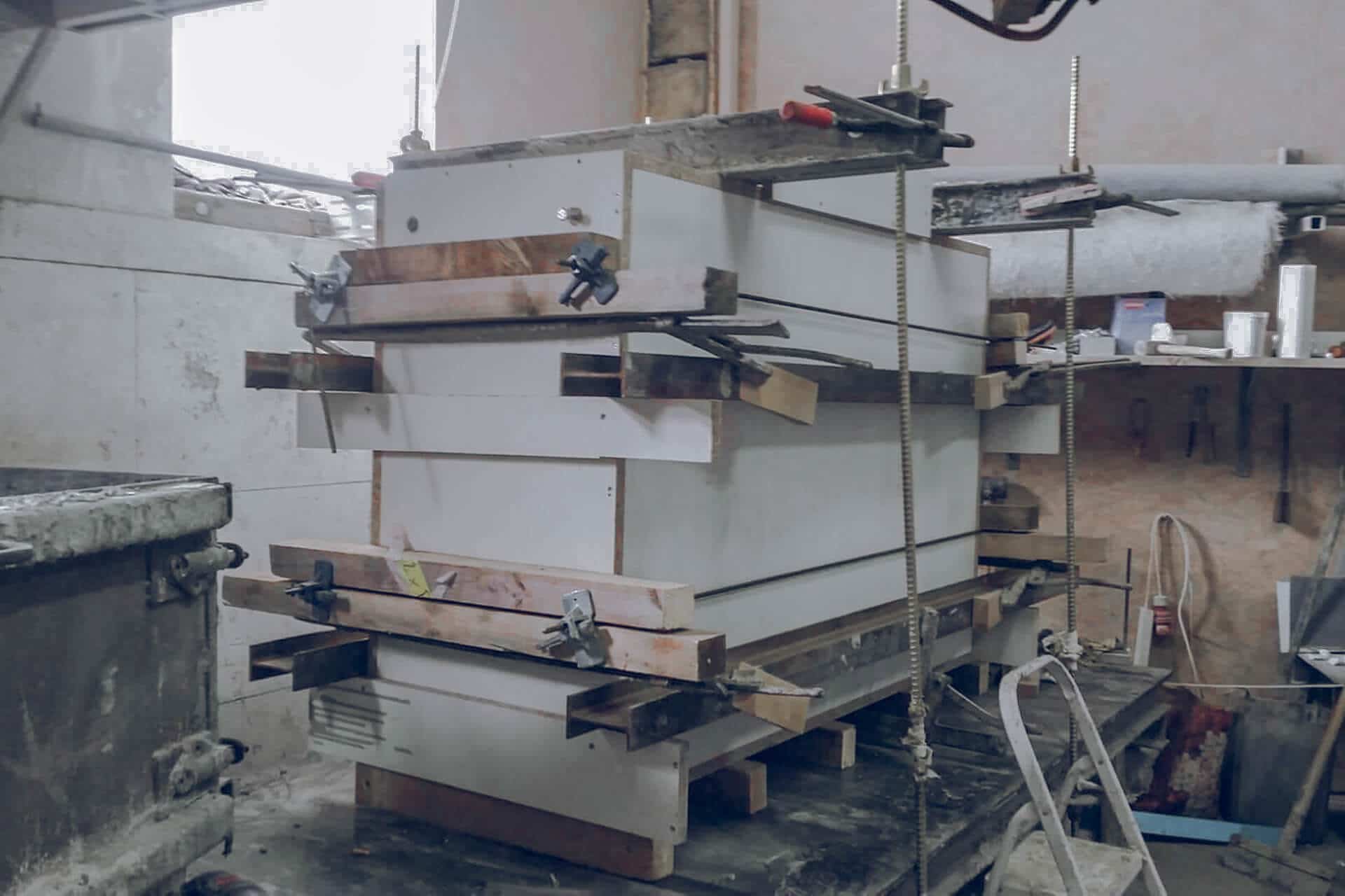At the beginning there is CAD design. In order to fully utilize the advantages of 3D printing, voxeljet opted for a hybrid formwork, a combination of printed and conventional mold elements. The 3D-printed elements were limited to the complex part, the front of the company stone. Simple geometries, such as straight surfaces, are modelled with conventional wooden formwork.