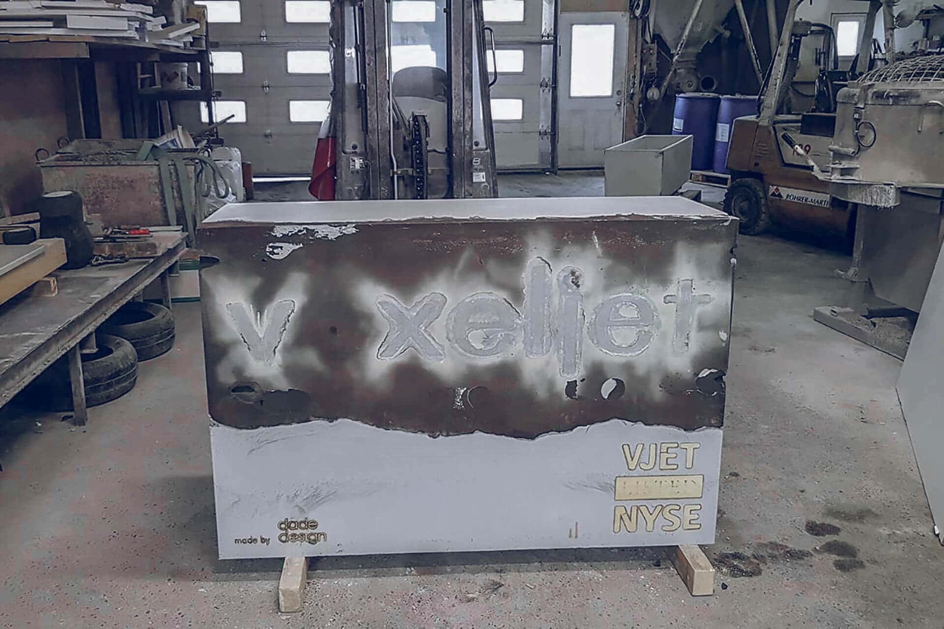 After the printed logo had hardened, Dade Design poured the rest of the company stone in the second step. For this, the concrete foundry used a self-compacting concrete, UHPC (Ultra-High Performance Concrete). The concrete was completely cured after around 20 hours and the formwork could be carefully removed. After removing the formwork, the voxeljet company stone was as good as finished. For the final touch, employees from Dade-Design gave the stone a so-called concrete cosmetic, in which they polished the concrete in order to obtain an even and smooth surface.