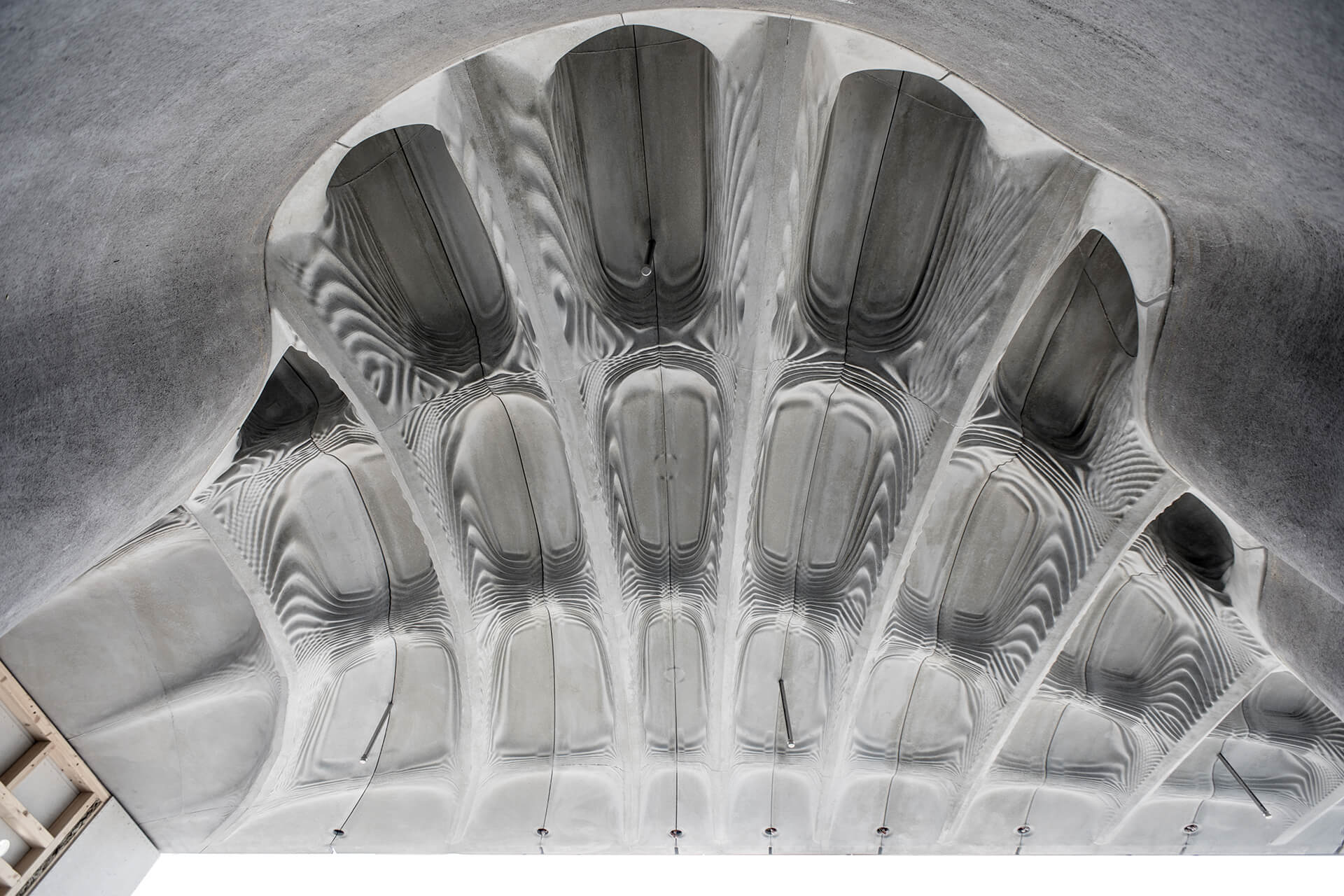 voxeljet has highly specialized 3D printing systems for the production of complex formwork using the binder jetting process. Highest detail resolution and speed combined with new scope for design flexibility are the focus of our 3D building technologies. Three-dimensionally curved and complex elements can be printed quickly and cost-effectively as thin-walled formwork skin. Simultaneously, tried and tested construction processes are retained, and the construction materials remain unchanged. Even 21mm-thin voxeljet formwork elements can withstand a formwork pressure of < 100 kN/m² and can be easily combined with conventional formwork.
