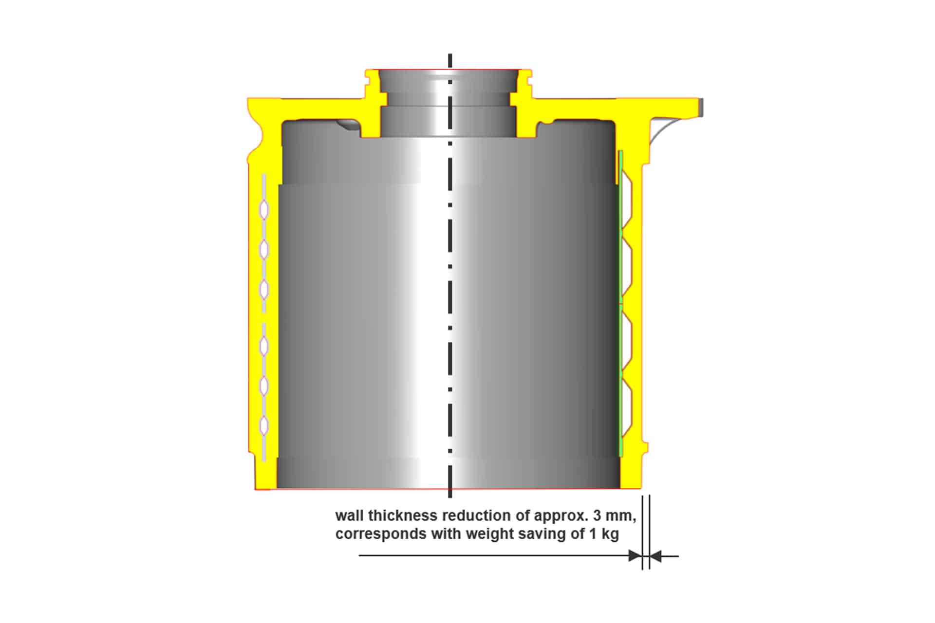 This concept makes it possible to reduce the wall thickness between the stator and the water-carrying channel from approx. 5 to as little as 1.5 mm. This wall thickness reduction is also reflected in the overall weight of the electric motor housing for a typical BEV traction motor, which is reduced by approx. 1 kg.