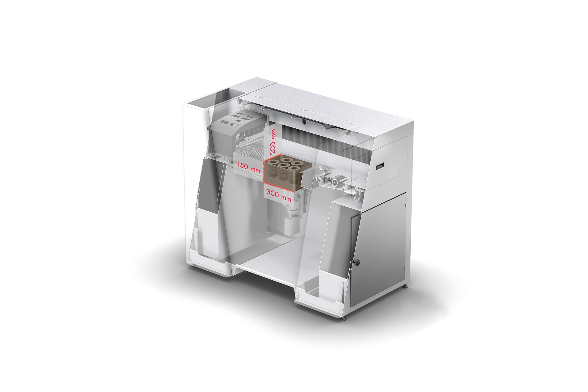 With a footprint of 300 x 200 x 150 mm and open source software, the VX200 is ideal for materials development and 3D printing of small, complex parts.