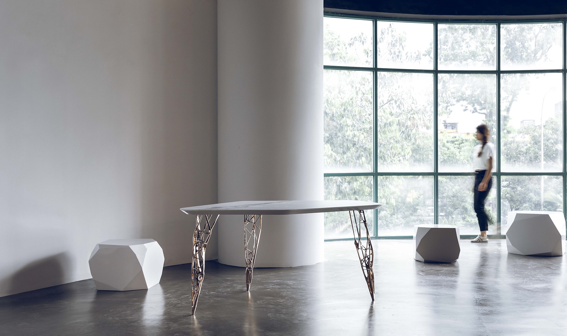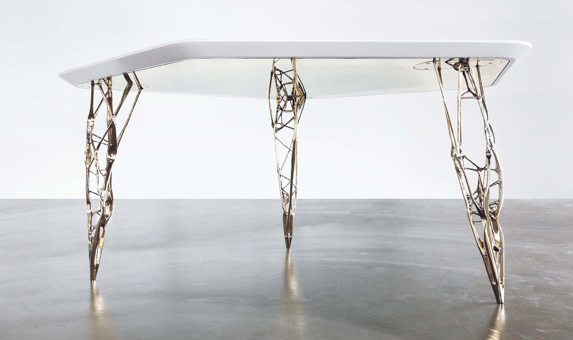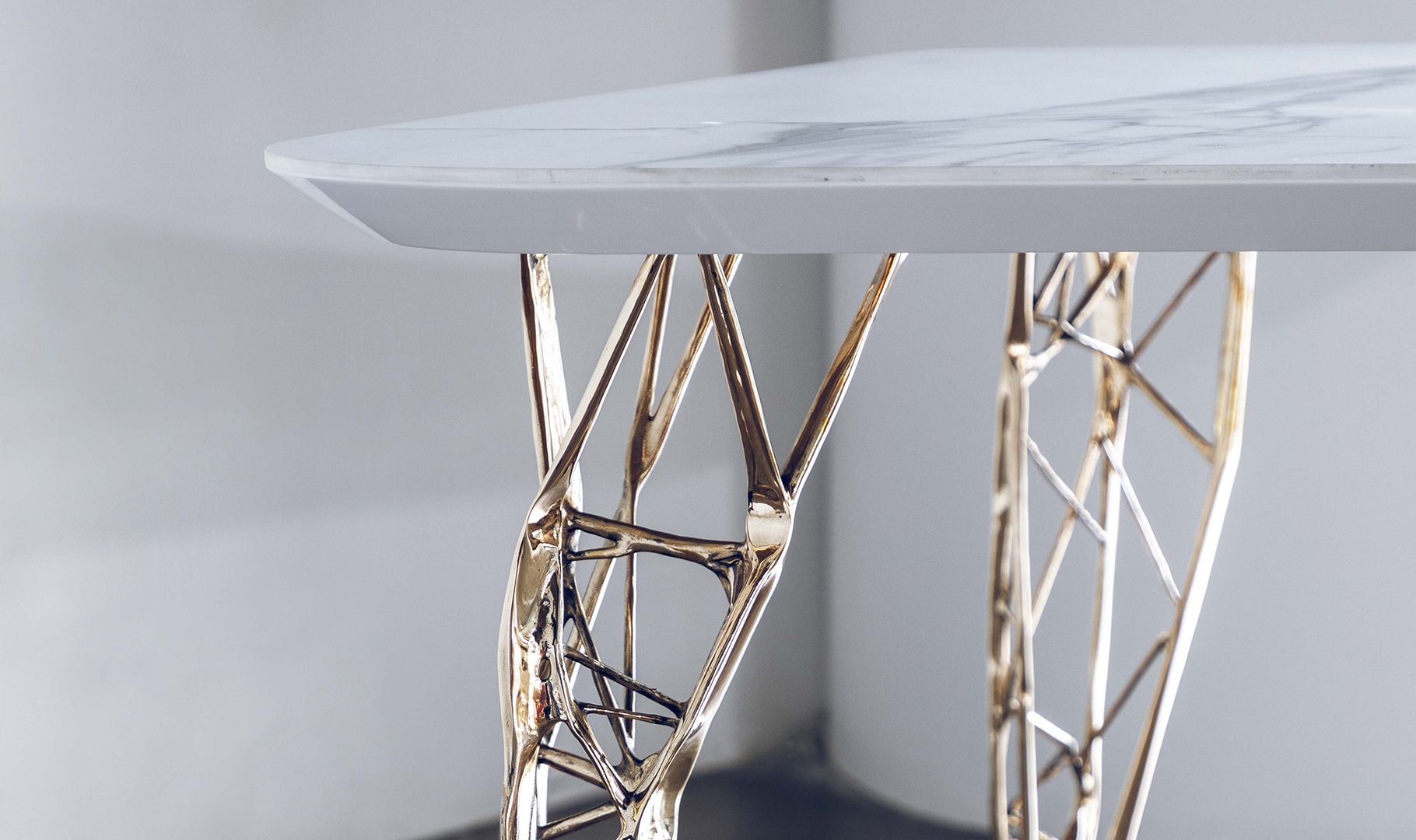 In fact, the idea behind these branching table legs is not just based on the creative mind of a human being, but also the AI functionality of Autodesk Fusion 360 software combined with powerful 3D printing technology and traditional metal casting. The idea was born in Singapore at the Architectural Intelligence Research Lab (AIRLAB), a design research laboratory from the Singapore University of Technology, where the idea of reliably absorbing the structural forces of the tabletop while using a minimum amount of material was discussed. The material of choice turned to bronze. Therefore, a positive pattern made of polymethyl methacrylate (short PMMA) was 3D printed, and the patterns were then transformed into cast parts by the renowned art foundry Strassacker, based in Germany. To cast the parts, the foundry molded the PMMA patterns into a ceramic shell that met the high-precision specifications. And as filigree as the end product may appear, in terms of stability these table legs are fully equal to a solid construction. The difference is made by a significantly reduced material input thanks to AI-assisted design and printed casting.
