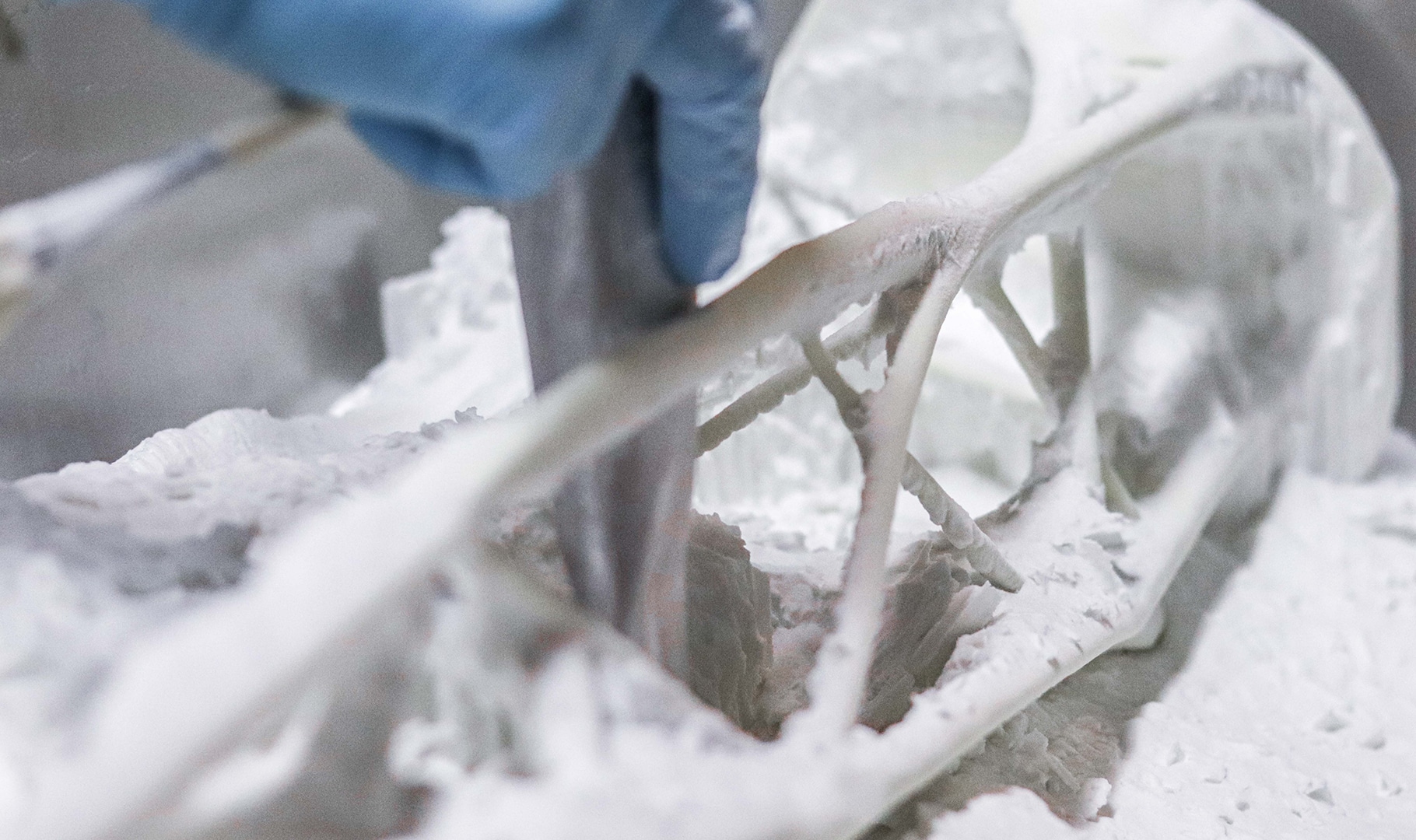 For example, 3D printed elements have already proven their utility on various construction sites. In traditional buildings, almost 80% of the material used goes into ceiling constructions. By combining AI software, 3D sand printing and concrete casting, this material consumption could also be targeted very effectively. There’s a lot of room for improvement, and that’s exactly what Carlos Bañón and Felix Raspall are going for. Having already tried out a variety of 3D printing technologies in the course of their work, the two architecture professors first came into contact with the process developed by voxeljet for producing investment casting models for the AI table project. Now they are already working on their next project that has little to do with polished bronze, but rather with solid concrete casting.